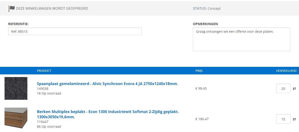 Via de webshop is het mogelijk een offerte aan te vragen. Door de gewenste artikelen toe te voegen aan de winkelwagen en deze te openen, kun je vervolgens klikken op 'Vraag als offerte aan'.